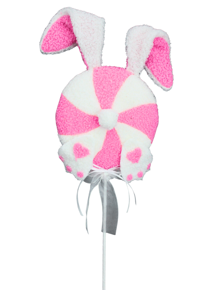 24" Pink and white fabric covered foam swirl lollipop on pick with bunny ears, tail, feet, and a ribbon bow. Ears have wires and are bendable. Candy piece is about 6" across. Fun addition to whimsical Easter themed wreaths, trees, centerpieces, florals, etc.