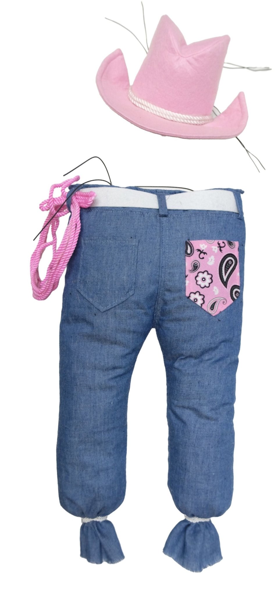 Stuffed cowgirl hat and legs decor kit in denim blue with pink hat, pocket, and rope. Made of polyester with wires for attaching. So much fun to add to Western themed wreaths, swags, and other crafts! Legs 18"H x 8.5"W, Hat 8.5"L x 4.25"H