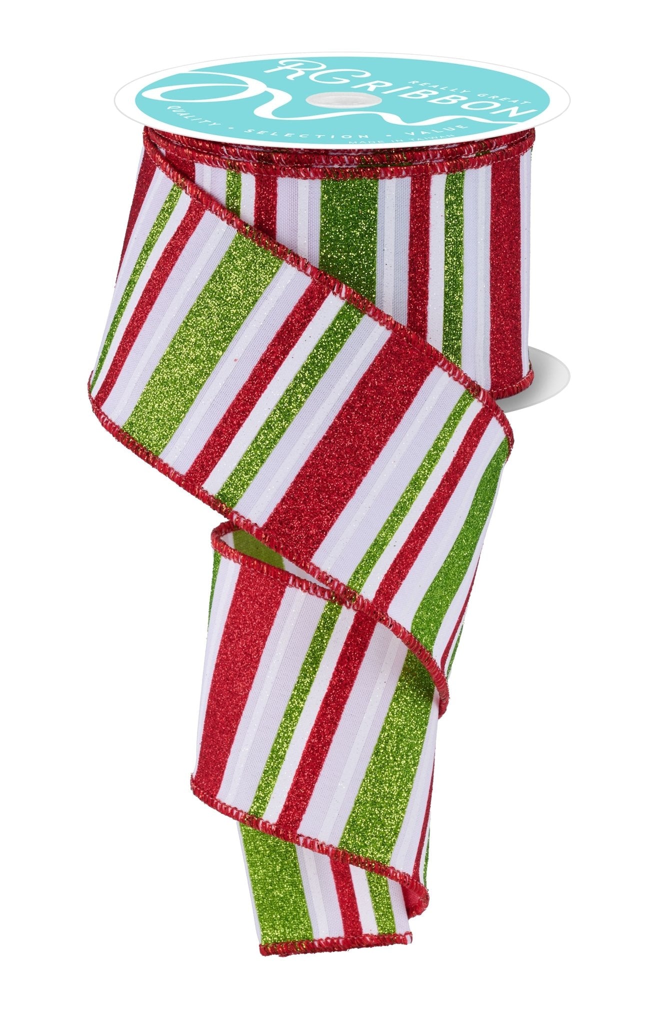 White ribbon with various sized horizontal stripes in white, red glitter, and lime green glitter. 2.5" x 10YDs, wired. Great for Christmas accents or tying up presents.