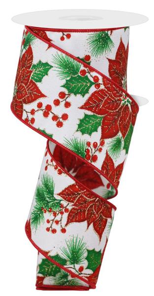 Beautiful Christmas floral ribbon. A roll of wired white ribbon with glittery poinsettias in red and gold and holly branches and berries in red and green. 2.5" x 10YDs. Great for Christmas Decor!