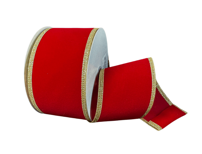 2.5" x 10yd roll of red velvet ribbon with a glittery gold edge. This ribbon is great for Christmas accents! The wired edges make this ribbon perfect for shaping into bows.