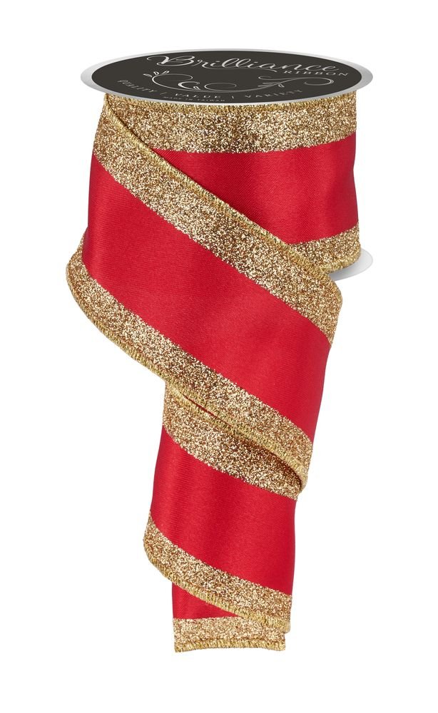 A 2.5" x 10yd roll of high quality ribbon with a red center stripe and edged in glittery gold. Great Christmas accent ribbon! Strong wired edges.