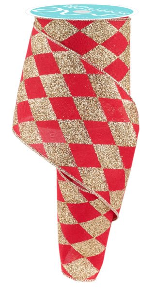 4" Glitter Harlequin Ribbon: Red/Gold - 10yds
