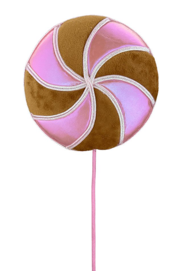 Brown velvet and pink metallic lollipop. Lollipop is 6.5" across on 22" pick. These picks are a perfect accent to your gingerbread or baking themed Christmas wreaths, trees, and centerpieces!