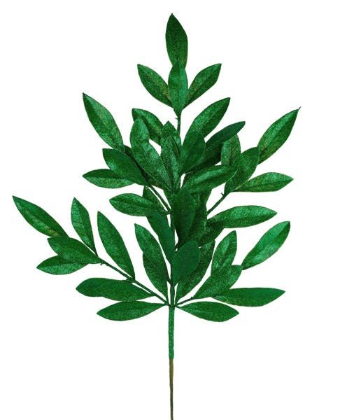 23" Emerald Green glitter bay leaf spray. Elegant accent to add to your Christmas decor: Wreaths, trees, centerpieces, florals, etc. Pull each stem off and use separately, or use as one full piece. Made of plastic.