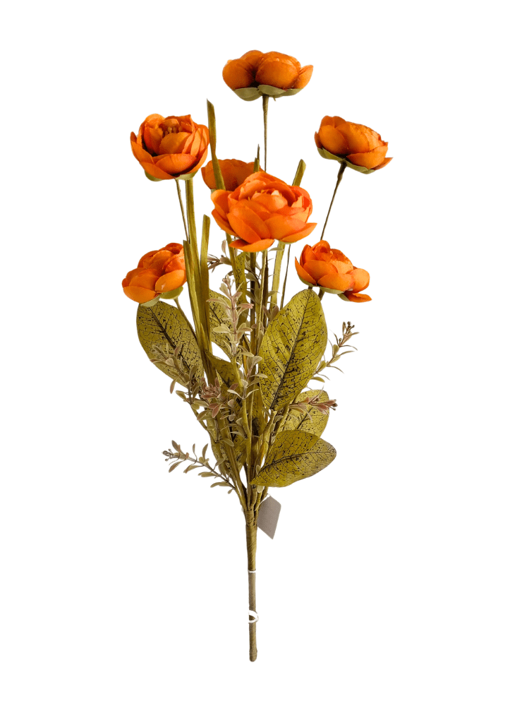 20" Ranunculus floral bush with orange ranunculus blooms and mixed leaves and grass. These flowers would make beautiful additions to your Fall wreaths and florals!