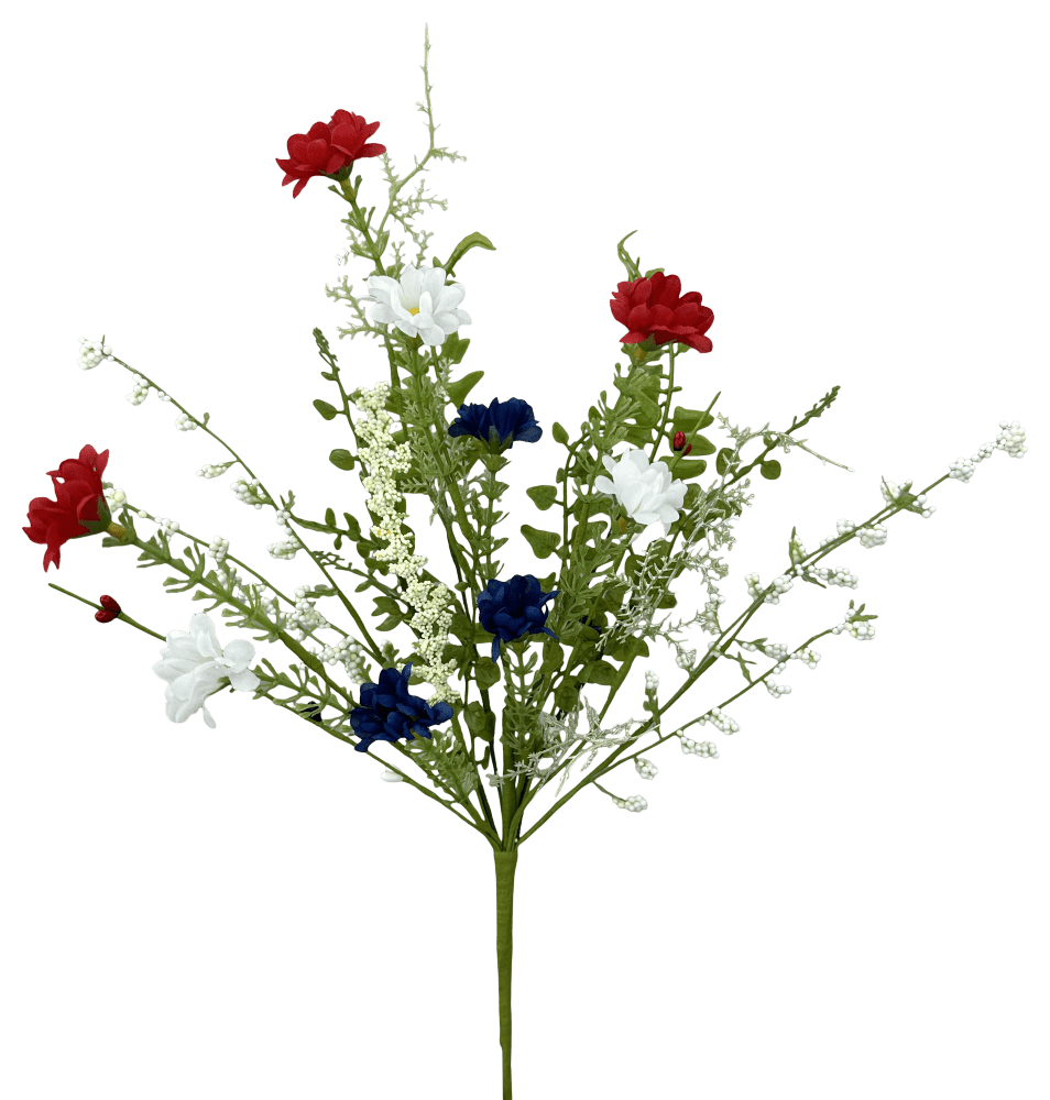 18" Red, White, and Blue Wildflower Spray with a mix of flowers, berries, and leaves. Use to fill in your patriotic wreaths and florals!