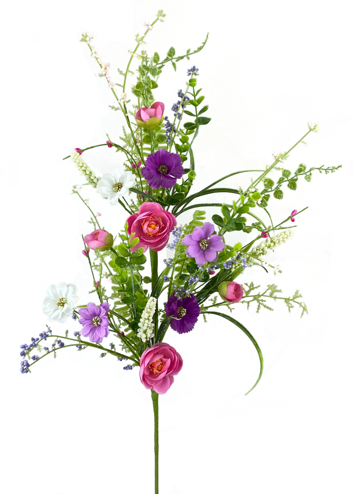30" Ranunculus filler floral spray with pink Ranunculus along with purple and white flowers with mixed green leaves and beads. These flowers would make beautiful additions to your spring and summer wreaths and florals! All you need is two sprays in a grapevine wreath, facing opposite directions, and a bow in the middle, and you have a beautiful spring wreath!