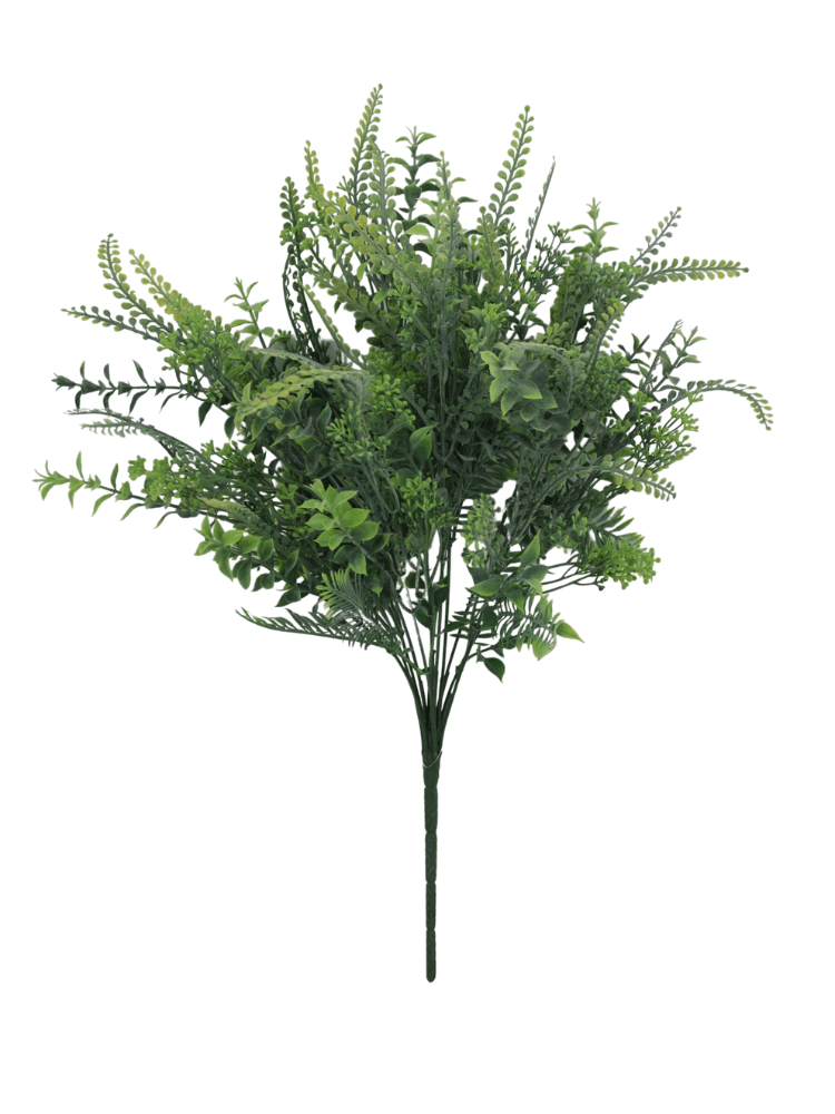 23" Plastic Mixed Greenery Bush. Great filler for any wreath or floral pieces! Cut off stems to use separately.