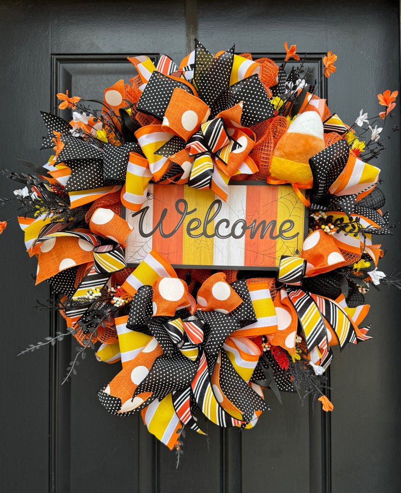 Decorate your door with this Halloween Welcome Wreath in fun candy corn colors. Made with orange and black deco mesh with a Welcome sign, plush candy corn, coordinating ribbons, and filler sprays. Measures 26" across with ribbons. Shipping included.