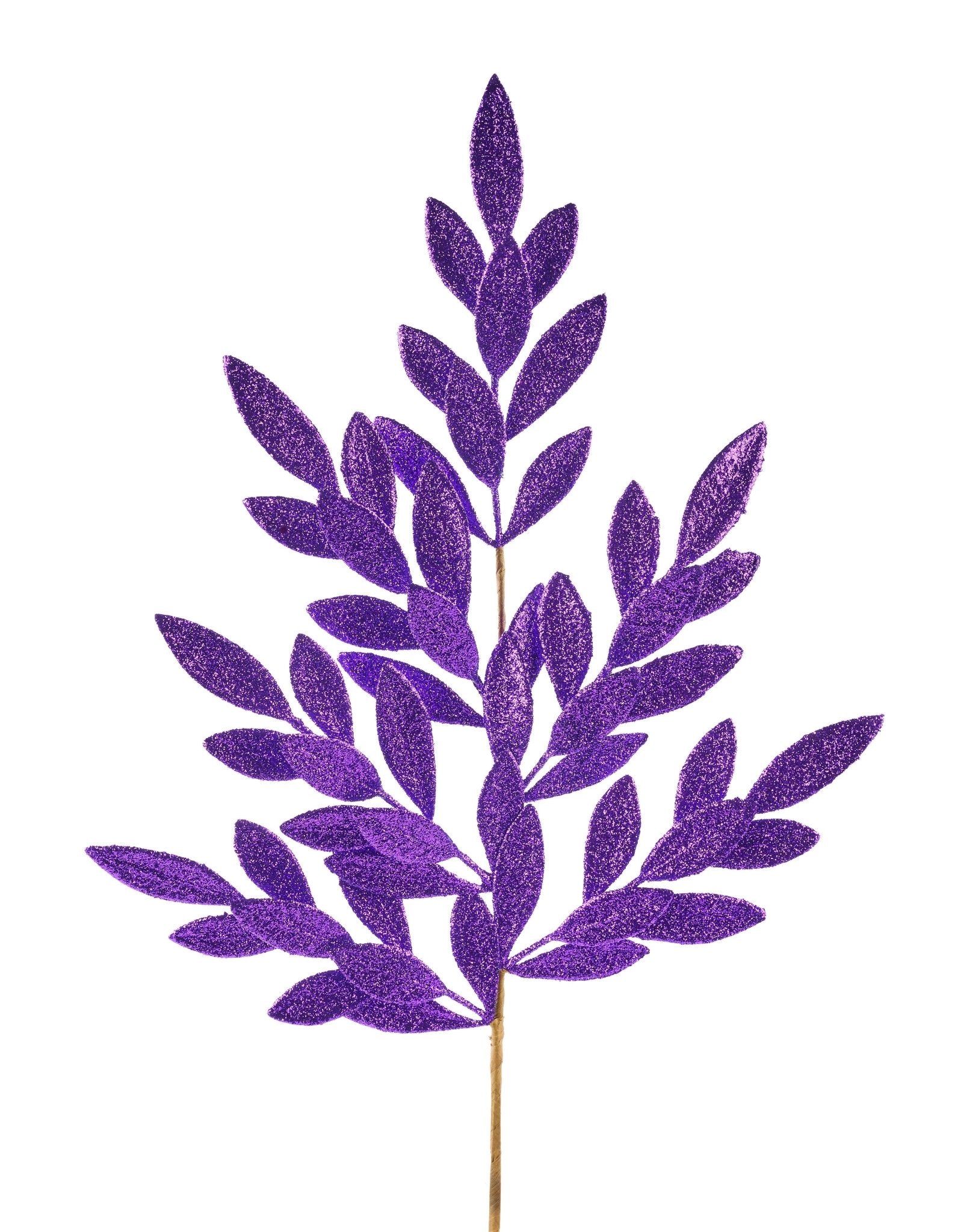 32" Purple glitter bay leaf spray. Elegant accent to add to your Christmas or Halloween decor: Wreaths, trees, centerpieces, florals, etc. Pull each stem off and use separately, or use as one full piece. Made of plastic.