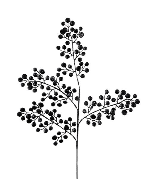 33" Black glittered spray with small round leaves. Great accent to add to your Halloween decor: Wreaths, trees, centerpieces, florals, etc. Pull each stem off and use separately, or use as one full piece. Made of plastic.