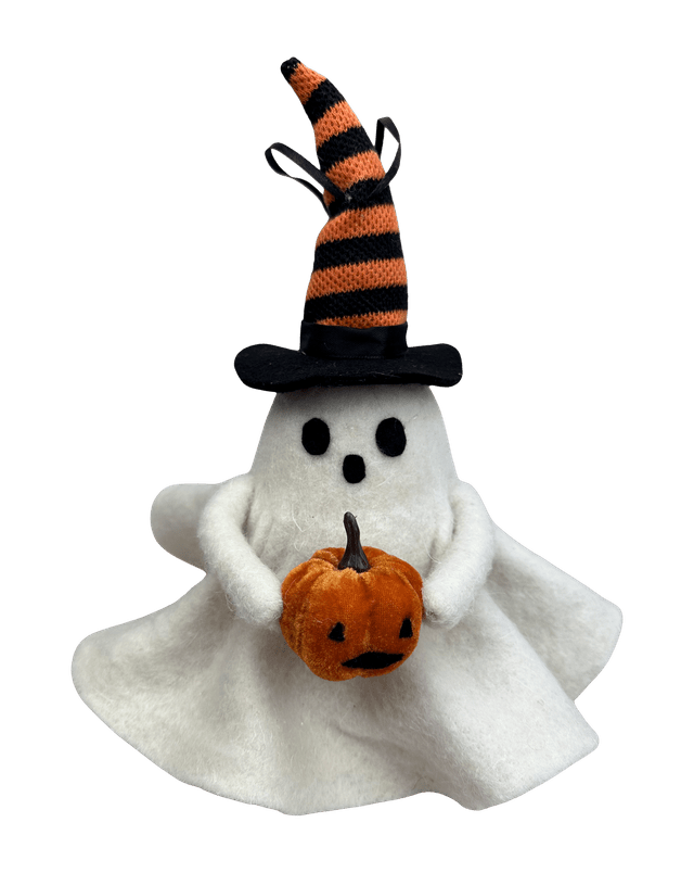 Cute Ghost ornament made from felt and fabric with black ribbon hanger.  Bottom is flat so he can hang or sit!  With an orange and black striped hat and holding a velvet pumpkin, he is sure to add fun to your Halloween decor!  Very lightweight  dd to a Halloween wreath or tree, centerpieces, etc.  11" tall (to top of hat) x 9" wide.