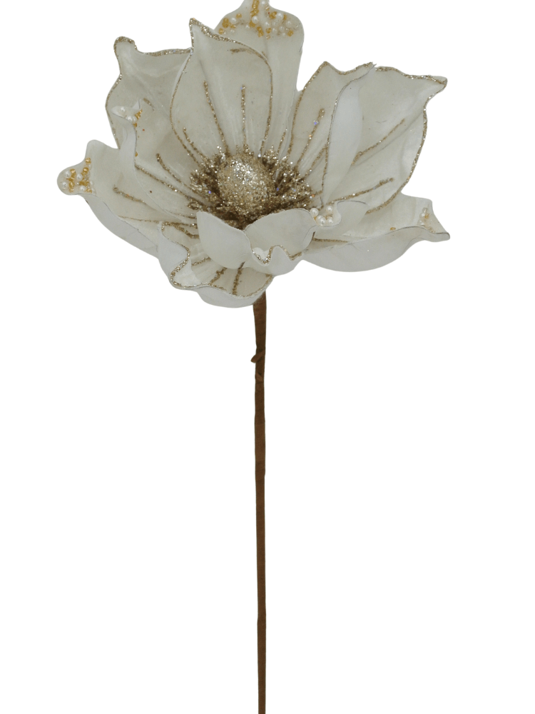 13" White velvet magnolia bloom edged gold with pearls and beads on several petals. Bloom measures approx. 9" in diameter. These picks would make beautiful, elegant Christmas accents! Add them to your wreaths, garland, floral arrangements, etc.