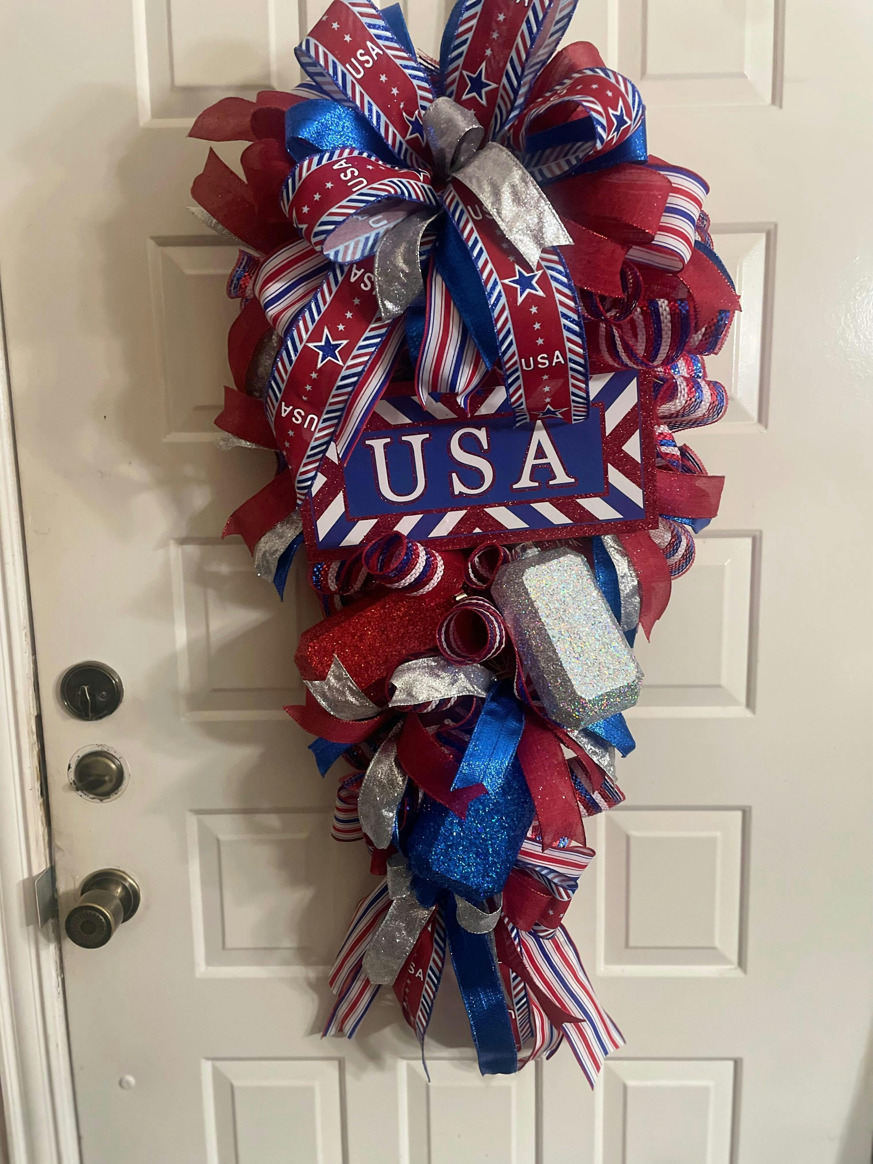 A roll of red, white and blue vertical stripes on white ribbon. Perfect for Patriotic bows and accents! 2.5" x 10yds, wired.