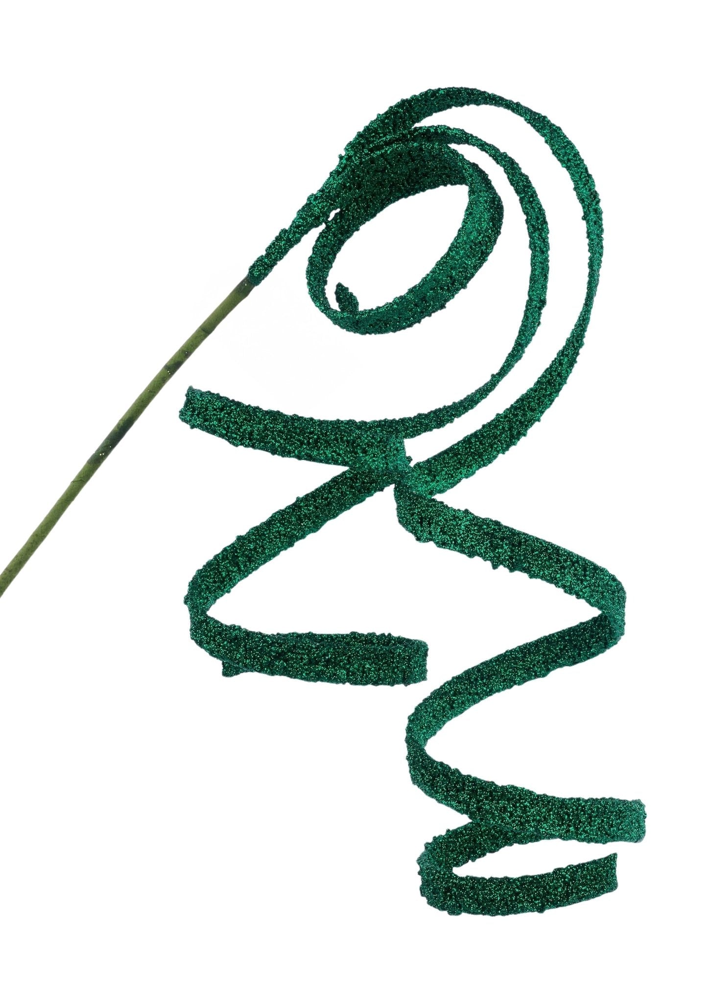 Curly emerald green glitter ribbon pick with three curls. Measures about 16" tall with ribbons hanging down. These are fun accents for Christmas trees.