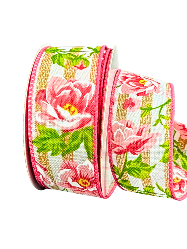 1.5" Pink Peonies on Tan/White Cabana Stripe Ribbon