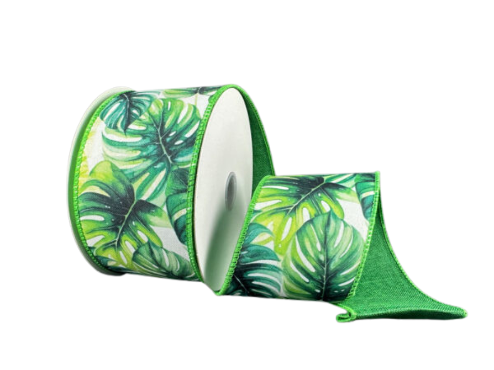 2.5" Double sided ribbon. One side has lush monstera leaves in shades of green on a white base and the reverse side is green linen. 10 yards, wired. Beautiful, bright ribbon for summer!