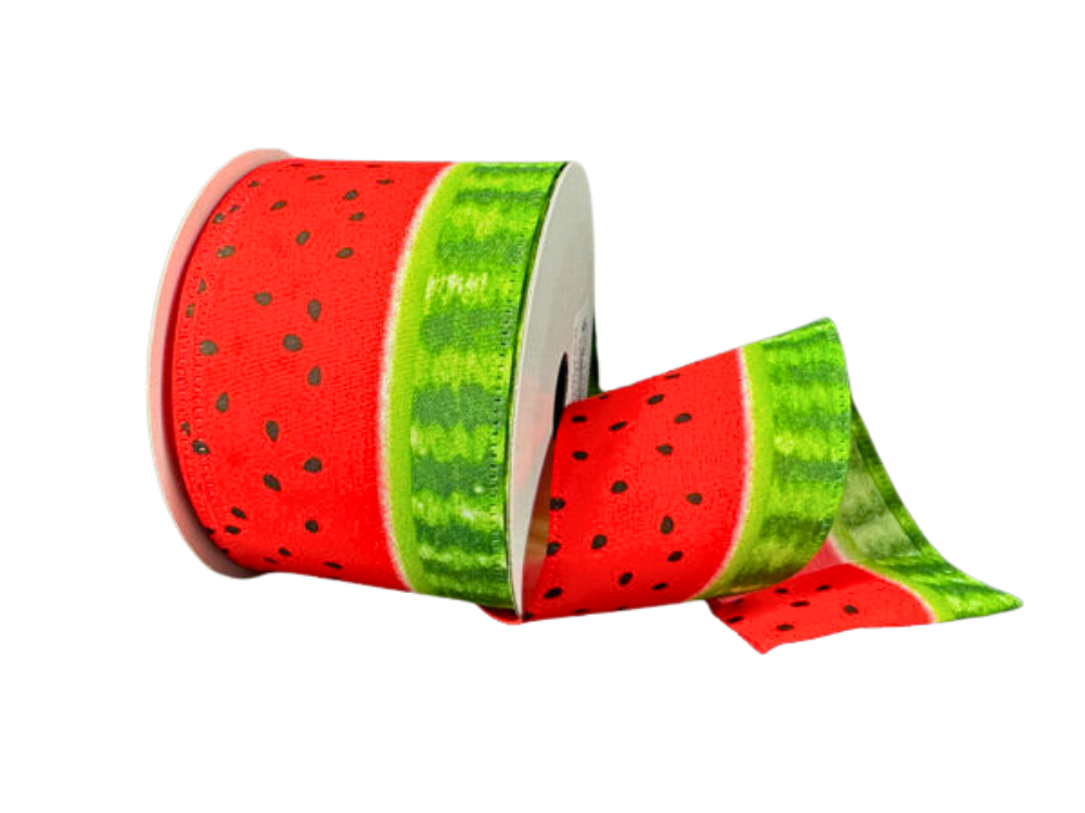 2.5" wide roll of satin/polyester ribbon with watermelon print, Wired, 10 yard length. Great print for spring and summer!