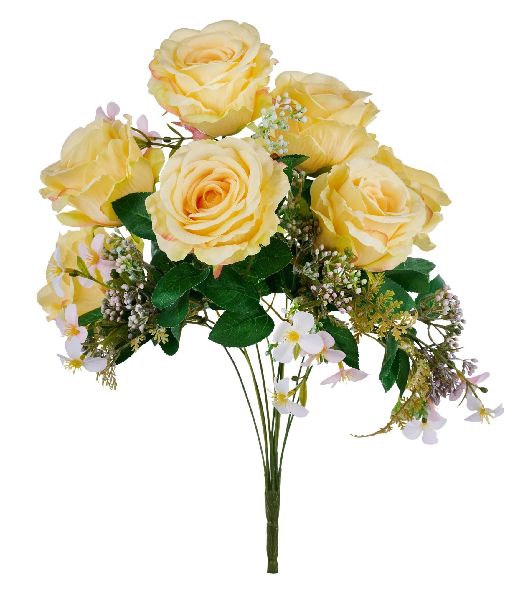 20" rose/leaf bush with yellow colored roses and small white flowers. These blooms would make beautiful additions to your spring wreaths and florals!