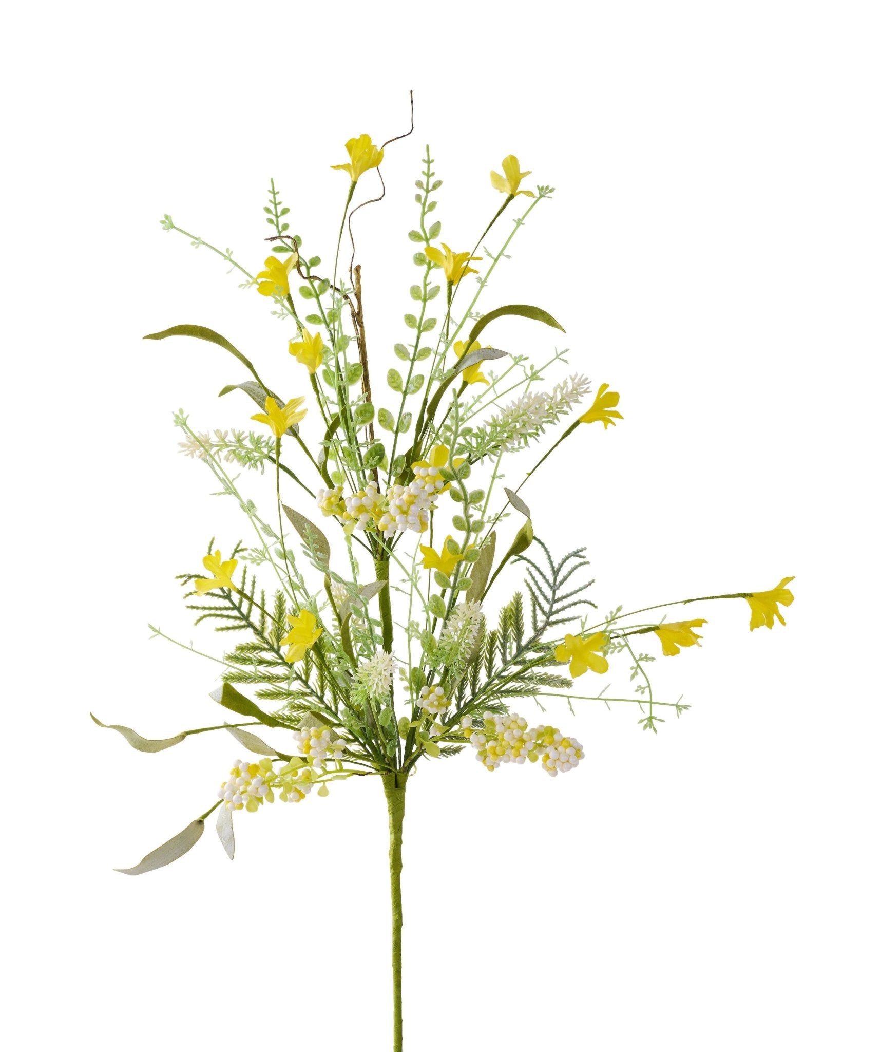 24" spray with small yellow flowers, eva foam green leaves, and small off white beads. Mix into your wreaths and florals to add a touch of color. Use the entire bush, or cut off stems to use separately. Perfect for Spring and Summer!