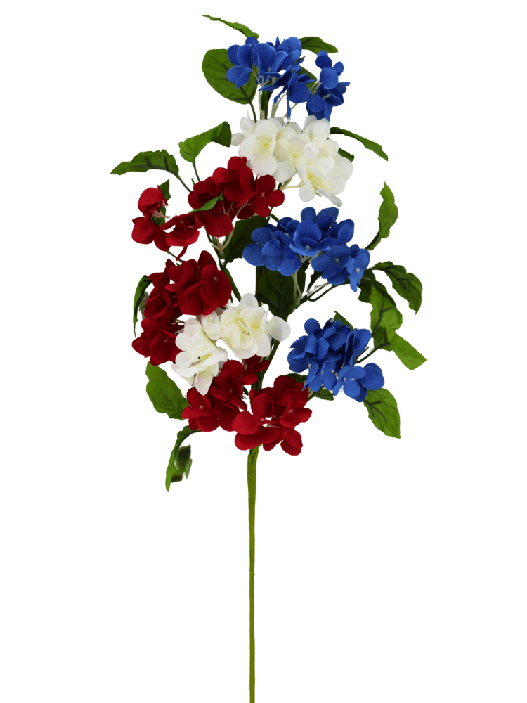 19" Patriotic hydrangea spray with 8 red, white, and blue flowers. These blooms would make beautiful additions to your patriotic wreaths and florals!