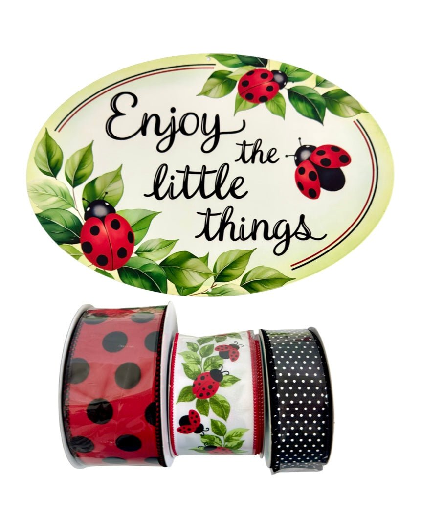 Enjoy the Little Things by making your own Ladybug Wreath or project with this bundle. Use to make your own wreath or swag how you like, whether on a grapevine or mesh base. Bundle includes 15" metal sign and 3 coordinating ribbons.