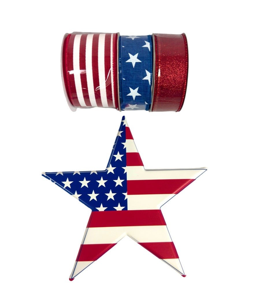 Celebrate America's 250th birthday with this metal star sign bundled with 3 coordinating ribbons. Use to make your own wreath or swag how you like, whether on a grapevine or mesh base. Bundle does not include mesh or form.