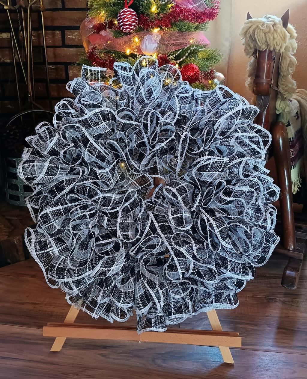10" X 10YD Metallic Mesh, black and white check pattern with black and white foil. This mesh could be used any time of year! Use to make deco mesh wreaths or garland, decorate your tree or mantle, wrap gifts, and make bows!