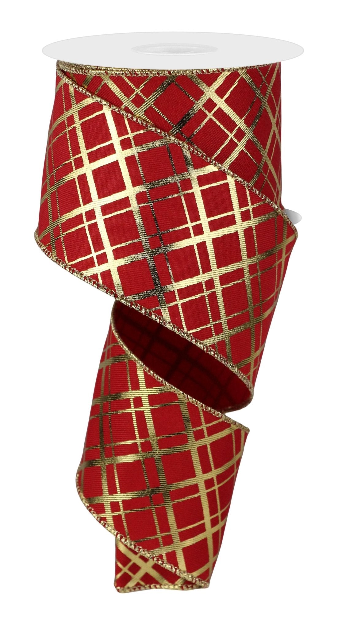 A 2.5" x 10yd roll of red linen ribbon with thick and thin metallic gold colored diagonal check lines. Great ribbon for Holiday bows and accents! Use to make wreaths, bows, for gift wrapping, or decorate your Valentine or Christmas florals or mantle!