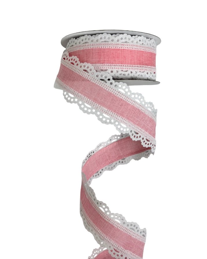 Rose Pink linen ribbon with lacy white scalloped edge. 1.5" x 10yds, wired ribbon. Add a touch of romance to your wreaths and crafts with this pink and white lacy ribbon. Great for Spring, Easter, and Valentines, with a bit of a vintage look!