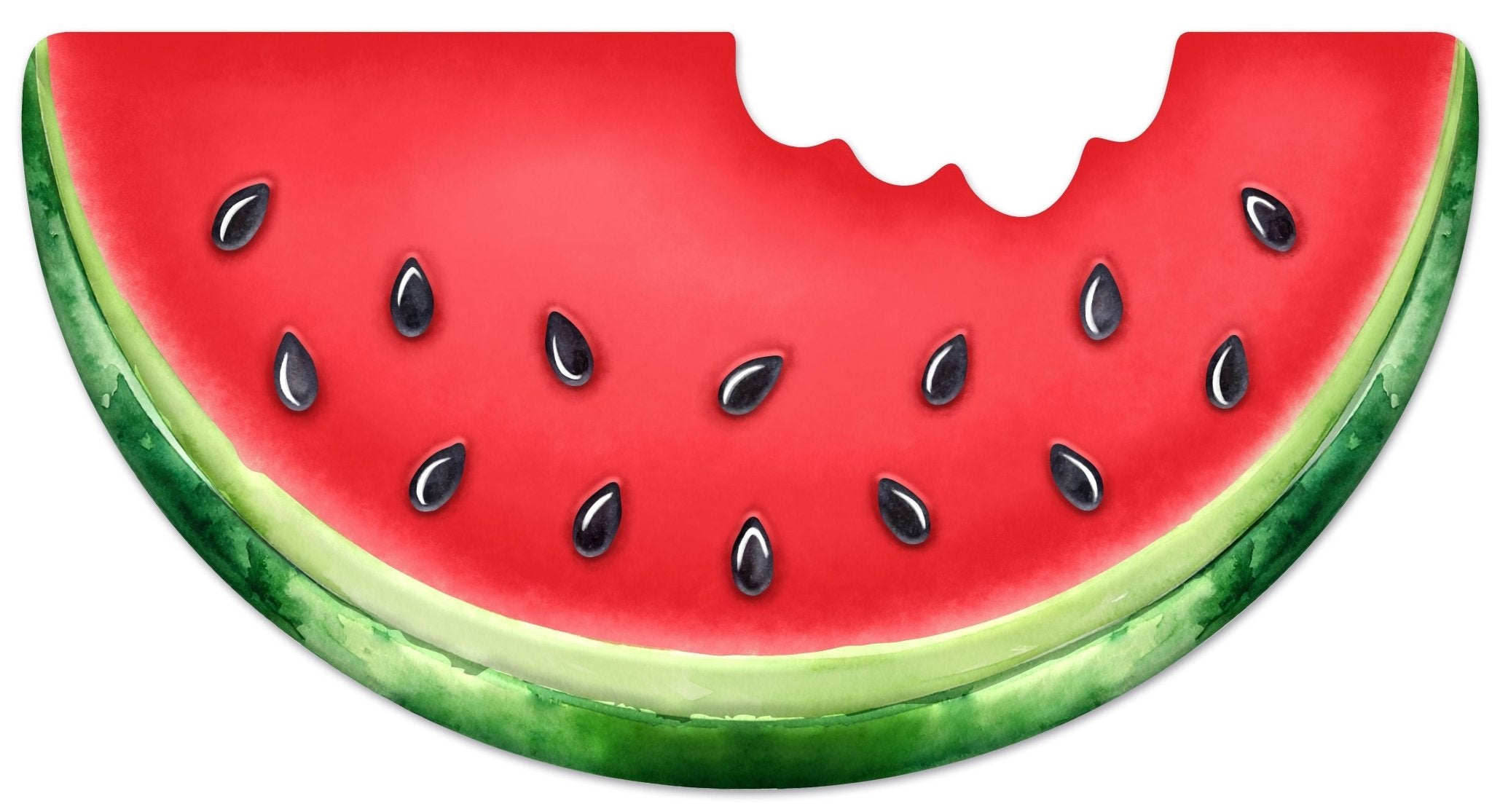 12" Embossed metal watermelon slice in red with seeds and a bite taken out! Made of heavy duty metal with attached sawtooth picture hanger on the back. Cute addition to your summer wreaths or decor! Measures 12" x 6.25".