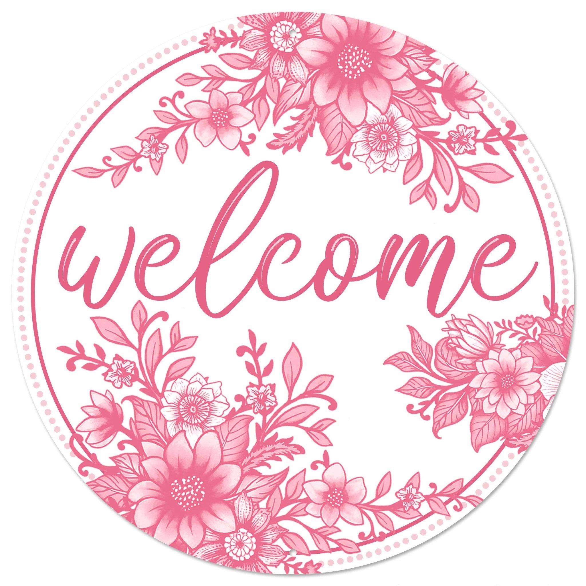 12" Metal circular Chinoiserie Welcome sign in pink and white. Made of heavy duty metal with pre-drilled holes at top and bottom for quick and easy mounting. Add a bow to instantly personalize your sign, or add to a spring wreath.