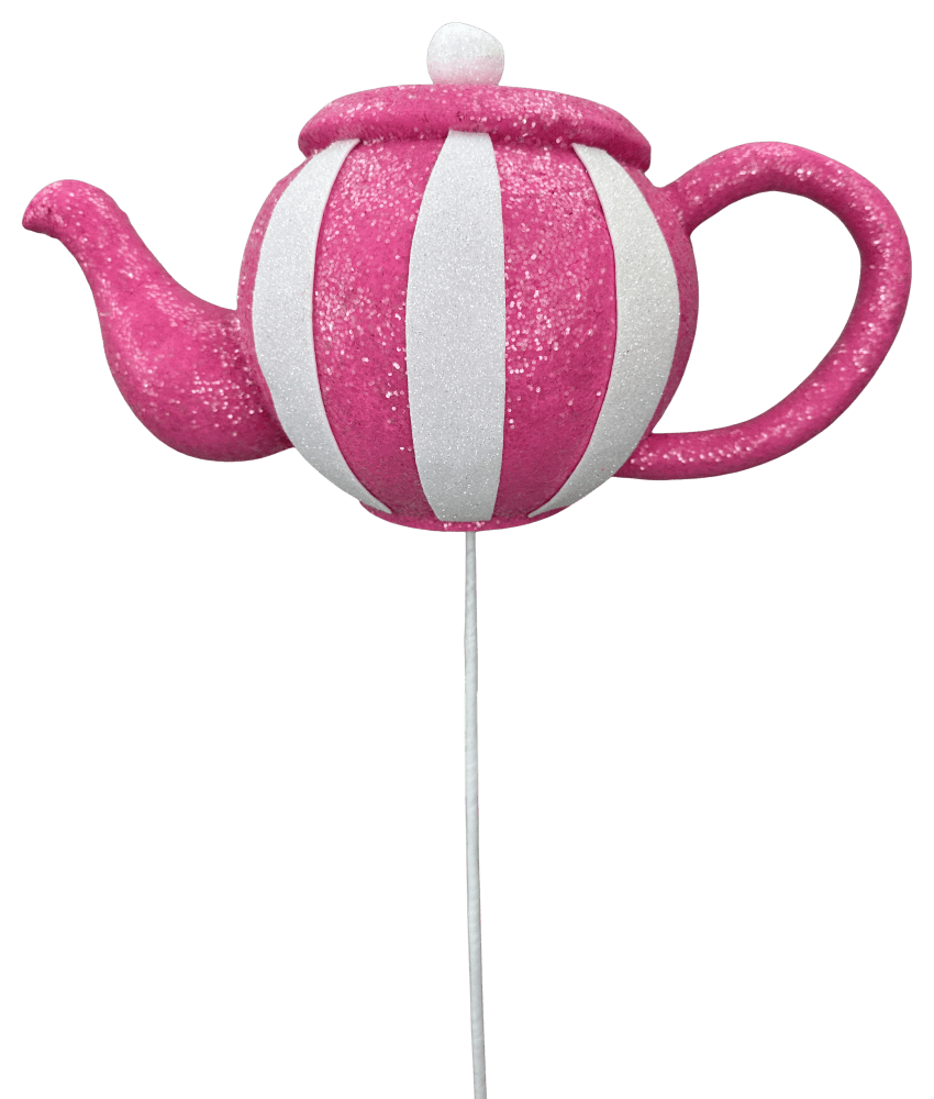 18" Pink and White Striped Glitter Teapot pick. Fun decor piece to add to your spring and summer wreaths, tree, mantle, or table decor. Teapot measures 6" tall and 10.5" wide. Pair with the matching teacup pick!