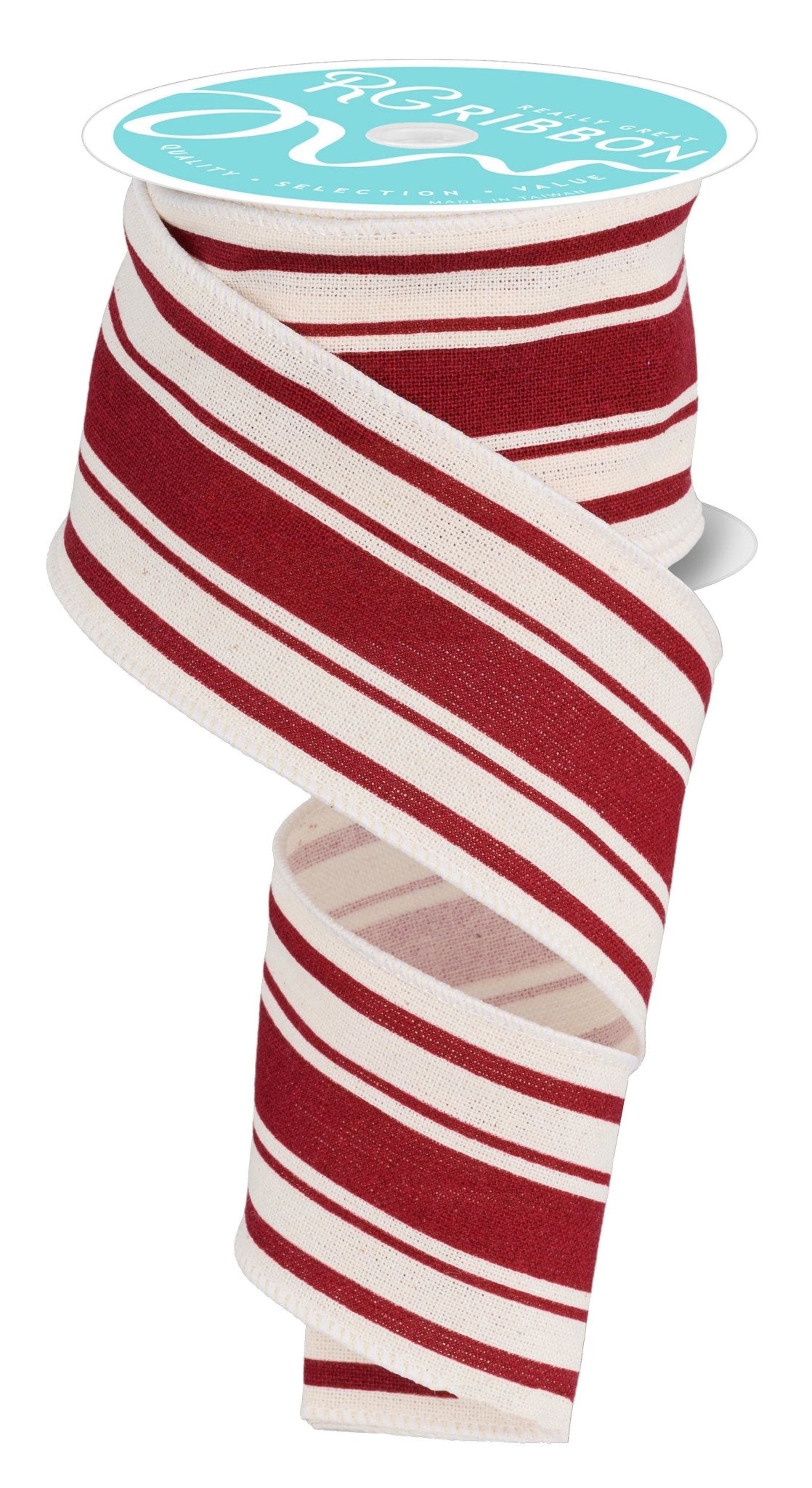 A roll of 2.5" ivory colored linen ribbon with bold burgundy stripes, giving it a farmhouse style look. Wired, 10 yards. Great for Fall Decor accents!