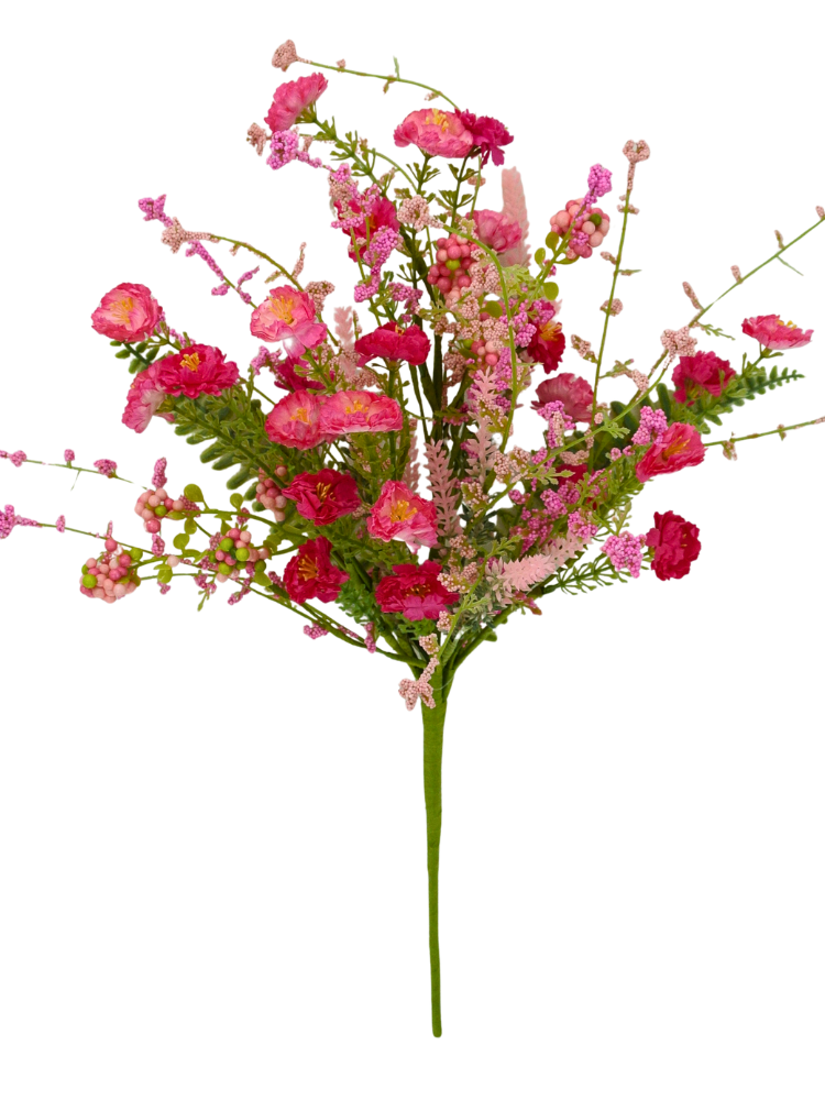 20" Spring Mini Flower Spray with small pink and hot pink flowers and green leaves. This greenery bush is a great filler for spring wreaths and floral pieces with an airy look.