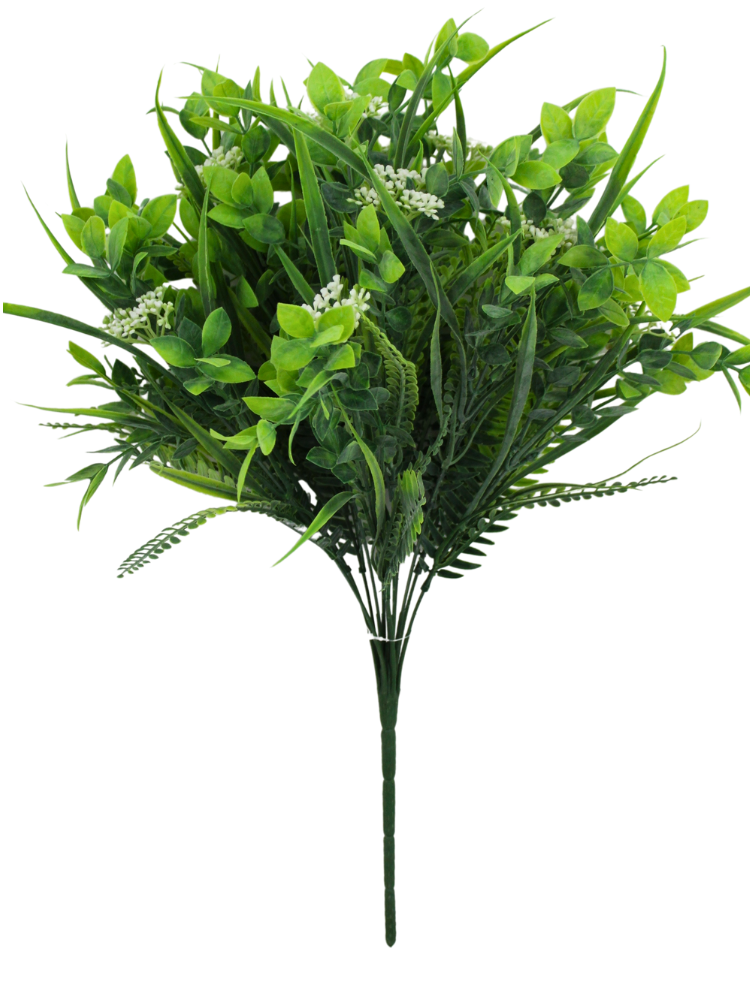21" Plastic Mixed Greenery Bush in a lighter green color. Great filler for any wreath or floral pieces! Cut off stems to use separately.