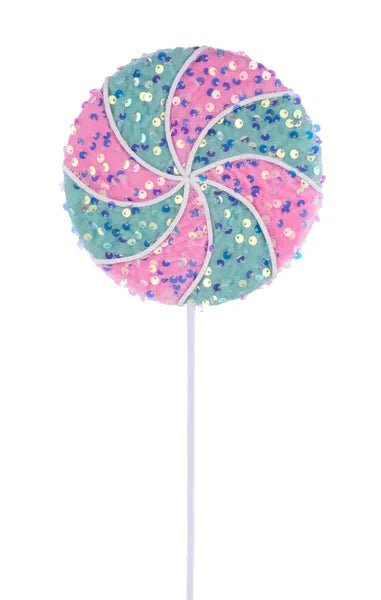 Large Mint and Pink sequin peppermint lollipop in a pinwheel design. Fun addition to whimsical candy themed Christmas, Easter, or Spring wreaths, trees, centerpieces, florals, etc. 21.5" with pick. Lollipop is 6" across.