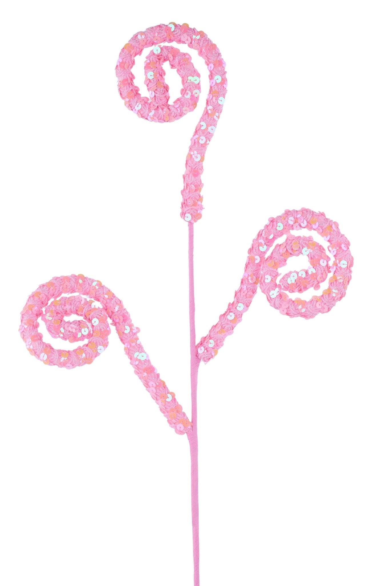 27" Light Pink iridescent spiral curly spray covered in sequins. Fun accent to add to Easter and Spring wreaths, centerpieces, trees, etc. Pull each curl off the stem and use separately, or use as one full piece.