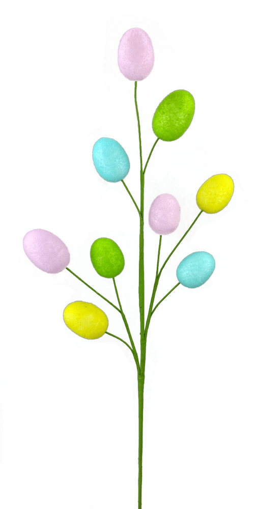 29" Flocked Easter egg spray with nine flocked foam Easter eggs in yellow, pink, green, and blue. Fun accent to add to your Easter wreaths, centerpieces, florals, etc. Pull off individual stems or use as one full piece.