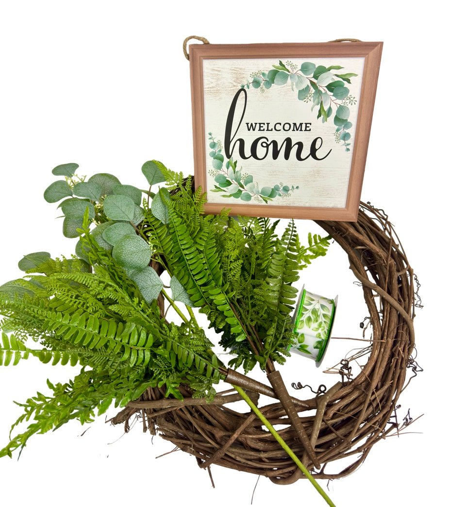 Make a simple everyday grapevine wreath with greenery with this wreath kit. Includes grapevine base, Welcome Home wood sign, 3 greenery bushes, and one ribbon.