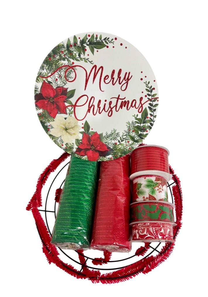 Make your own traditional elegant Christmas Wreath with this Christmas Poinsettia Wreath Kit. Includes 2 rolls of 10" mesh, wreath form, metal sign, and 4 ribbons.