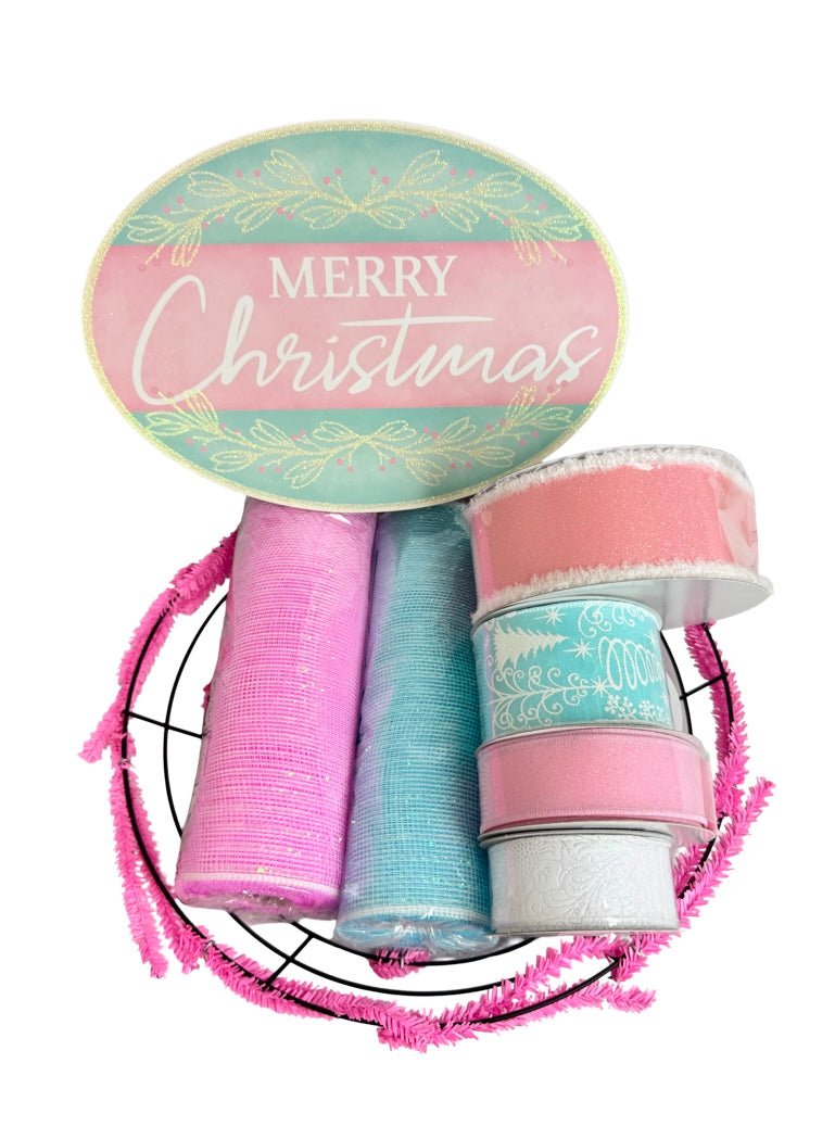 Make your own Christmas Wreath with this Merry Christmas Wreath Kit in light pink and blue. You will receive everything you need to make a Deco Mesh Christmas wreath. Includes 2 rolls of 10" mesh, wreath form, wood sign, and 4 ribbons. (The picture of the finished wreath has one extra polka dot ribbon that we no longer have.)