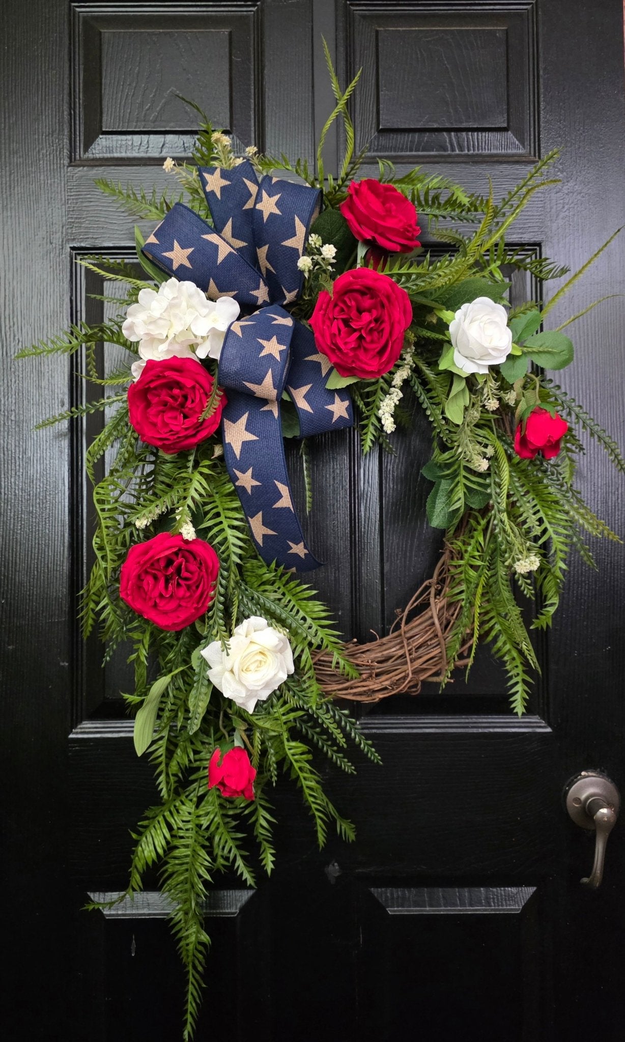 Find the supplies to make your own Patriotic Rose Grapevine Wreath Here