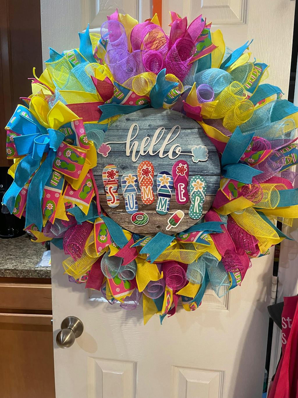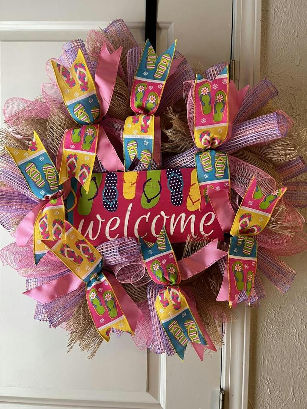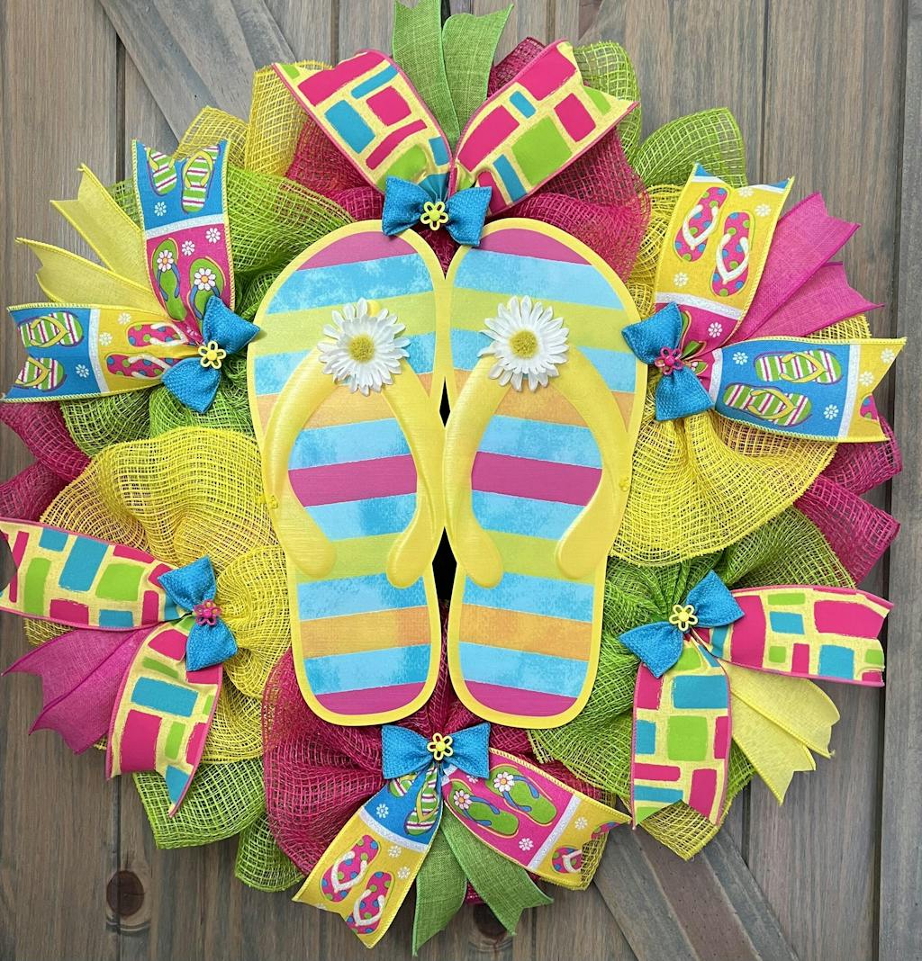 2.5" Wide roll of bright multi-colored linen ribbon with flip flops and daisies printed in color blocks in turquoise, hot pink, lime green, yellow and white. Wired, 10 yard length. Bright fun print for spring and summer!