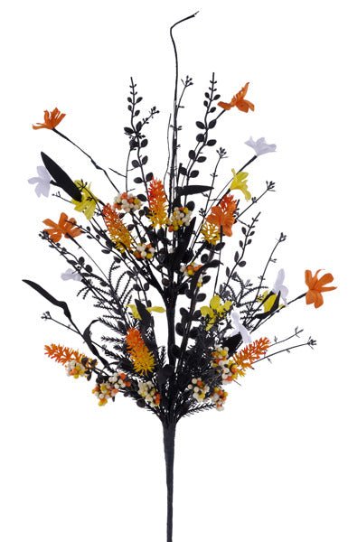 24" Mixed Halloween Floral Spray with small orange, yellow, and white flowers and beads and eva foam black leaves. Mix into your Halloween wreaths and florals to add a touch of color. Use the entire bush, or cut off stems to use separately. Fun addition to candy corn themed decor!