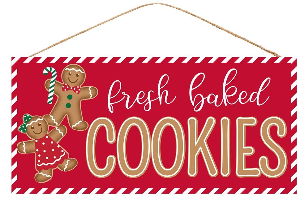 Fresh Baked Cookies sign with gingerbread cookies and red/white border. This sign is made of mdf with a printed adhesive sticker. Perfect sign for a fun Christmas wreath or add to your tree as a large ornament!