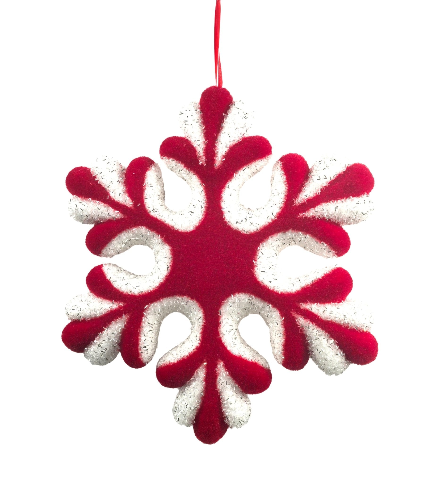 15" Red and white snowflake ornament made with foil tinsel type material on styrofoam, with a ribbon attached for hanging. Great for Christmas Tree accents or wall decor. Lightweight.