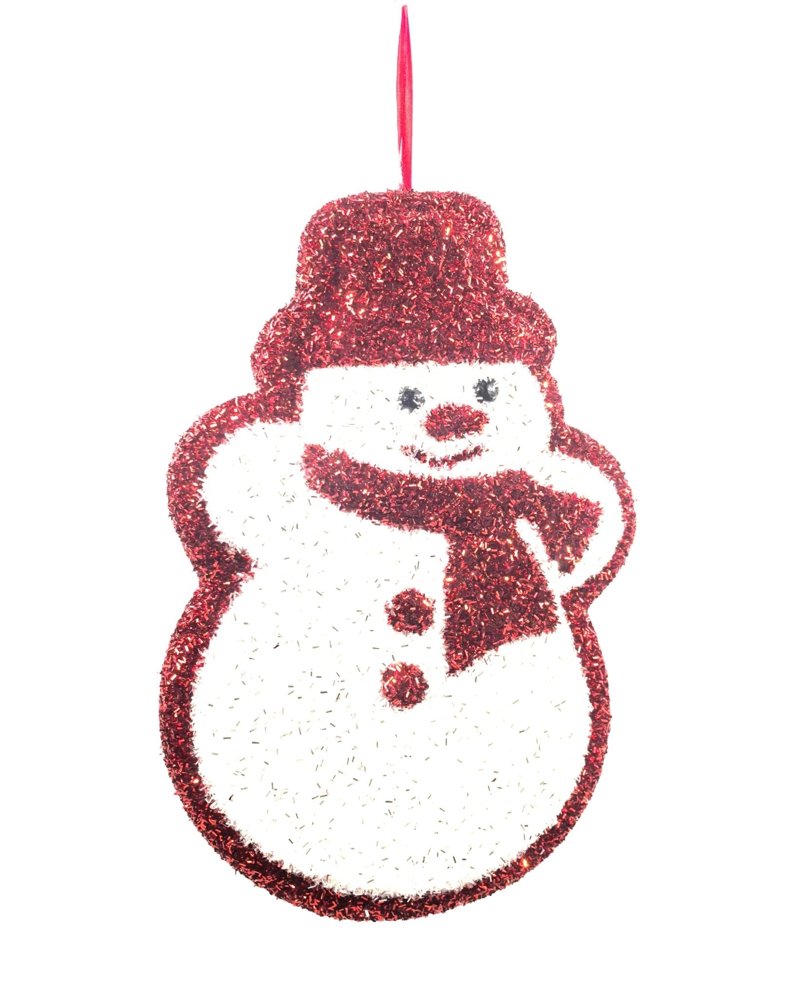 15" Red and white snowman ornament made with foil tinsel type material on styrofoam, with a ribbon attached for hanging. Great for Christmas Tree accents or wall decor. Lightweight.