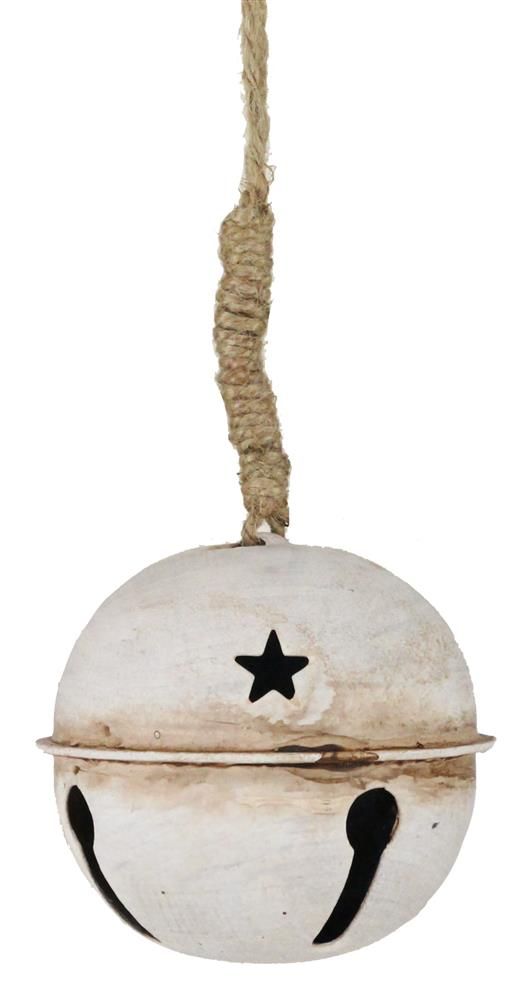 An antique white colored, metal 3.5" Jingle Bell with a jute hanger. Great for Christmas Decor, Wreaths, and Trees!